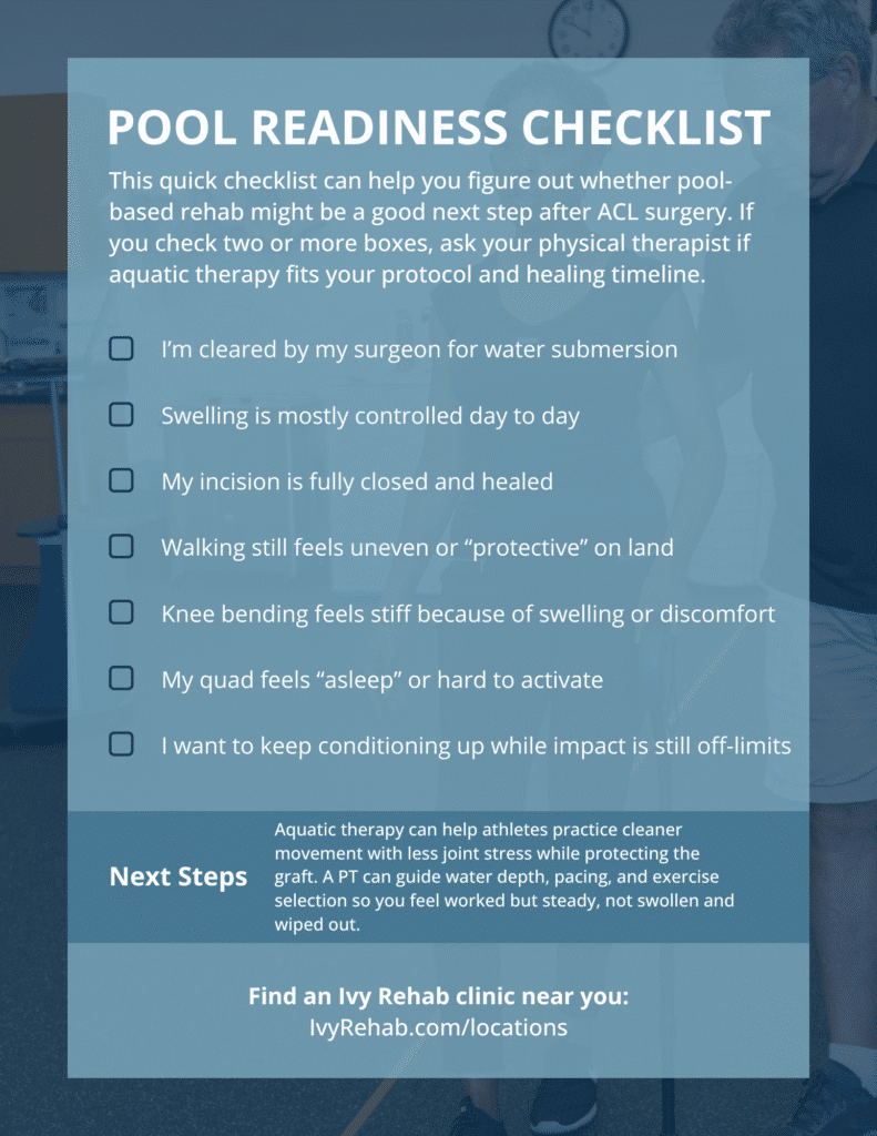 If you’d like to learn more about sport-specific ACL rehab, explore Ivy Rehab’s ACL Rehab program and our aquatic therapy services.