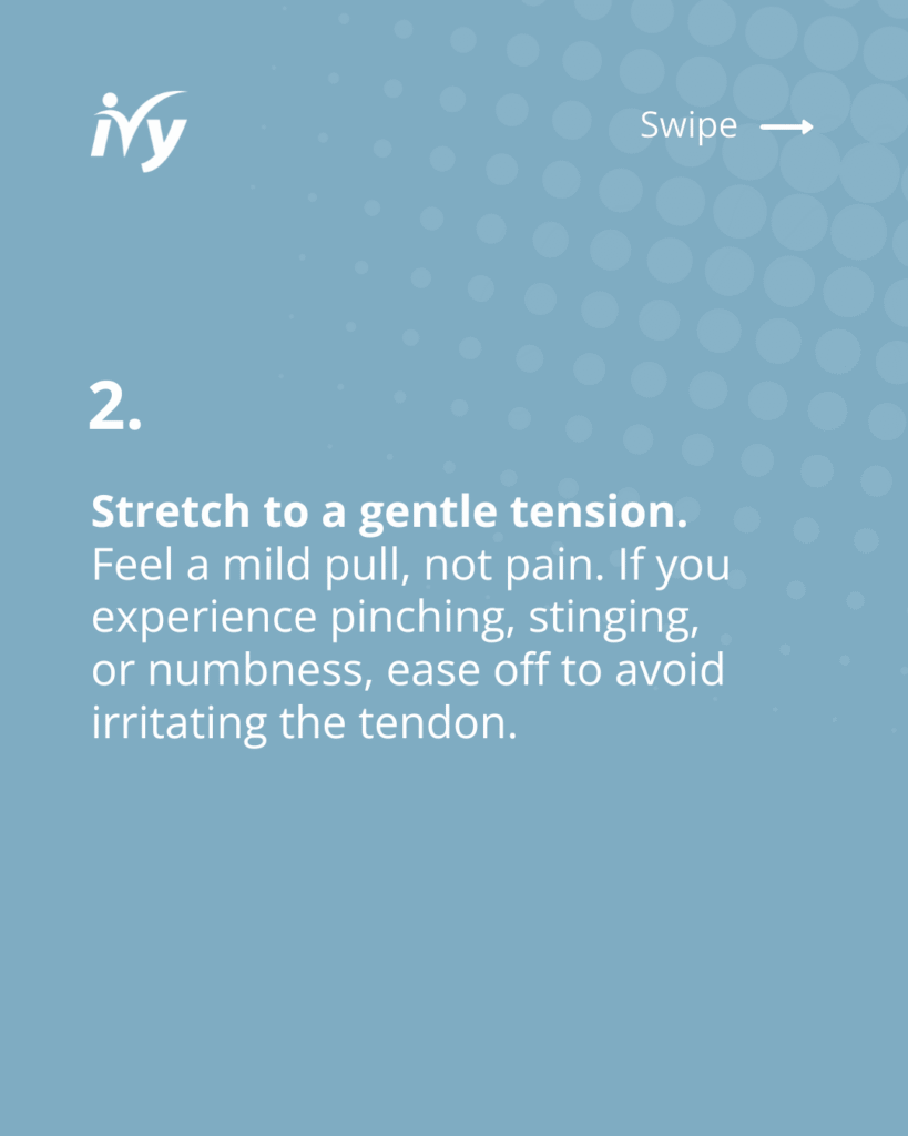 - Move slowly. Quick, forceful stretching can irritate the tendon rather than help it.