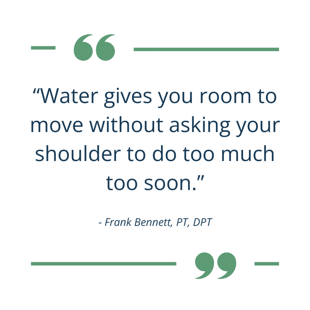 Water offers resistance in every direction, but not from abrupt loading by weights. That makes it useful for controlled activation early on and gradual strengthening later, once your shoulder is ready.